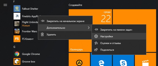 Чуточку удобнее в следующей версии системы станет меню Пуск: в контекстном меню универсальных приложений появится пункт Настройки, ведущий в панель дополнительных параметров приложения.