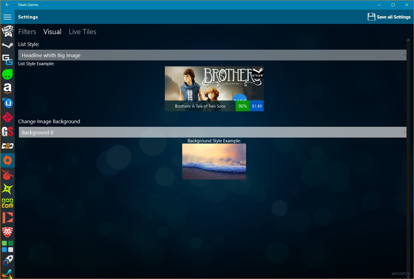 Прямо из окна Deals Games можно перейти на страницу выбранной акции, поделиться ею с другим устройством или приложением. В настройках приложения разрешается выбрать одну из поддерживаемых в текущей версии валют, настроить фильтрацию по ценам и оценкам Metacritic. Там же можно изменить внешний вид списка игр и живой плитки.