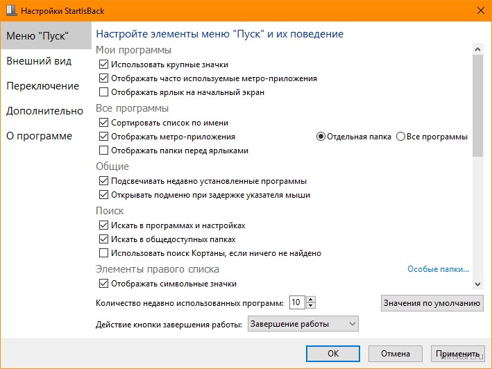При необходимости с поиощью StartIsBack++ можно провести и «липосакцию» оболочки Winodws 10, отключив автозапуск процессов SearchUI и ShellExperienceHost, а также процессов часто используемых универсальных приложений при старте системы. Тем кто не собирается возвращаться к использованию живых плиток приложений может пригодиться функция отключения пункта «Закрепить на начальном экране» в контекстном меню. На случай необходимости кратковременного возврата к системному меню, в арсенале программы имеется возможность его вызова при помощи настраиваемых горячих клавиш.
