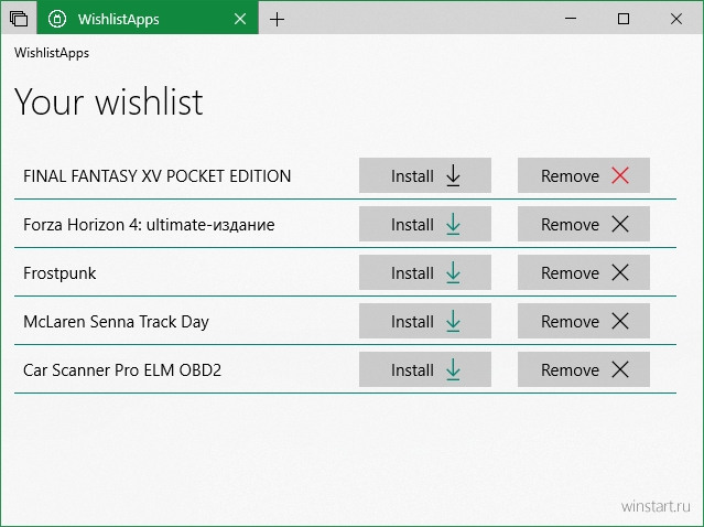 Для составления списка пользователю достаточно отправлять ссылки на нужные приложения или игры в WishlistApps прямо из магазина, воспользовавшись системной функцией «Поделиться». Кликом по кнопке «Install» в главном окне можно перейти к установке или приобретению выбранного элемента, кнопка «Remove» удалит его из списка.
